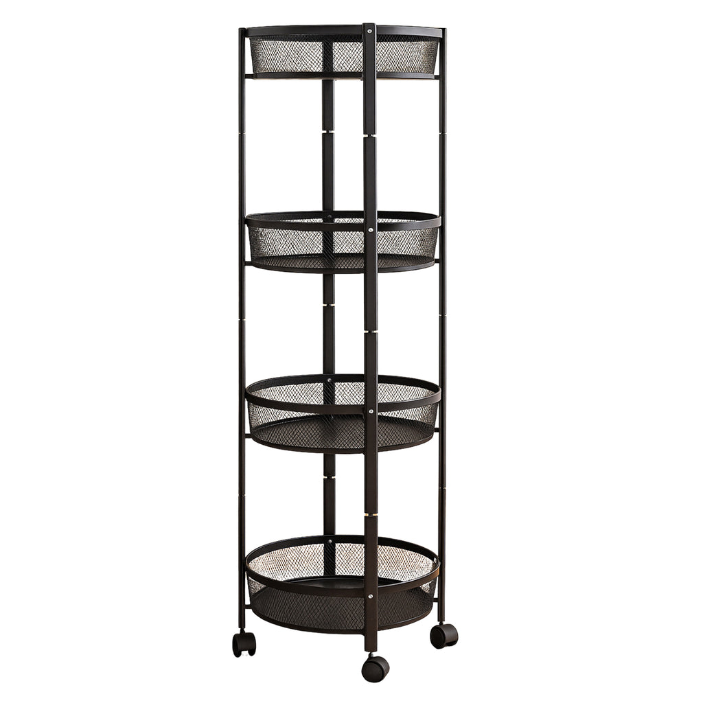 Organize your space in style with this 4-layer round metal mesh storage rack. Built with sturdy iron and finished in sleek black, this tall and slim rolling utility cart offers both functionality and aesthetic appeal. Its breathable mesh baskets are ideal for storing towels, fruits, toiletries, stationery, or kitchen items, while the 360° rotating wheels allow for easy mobility across rooms. Whether used in the kitchen, living room, bathroom, or office, this elegant storage rack keeps essentials accessible and organized without occupying much space.